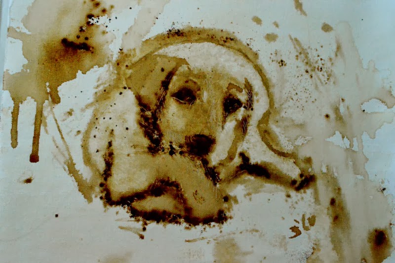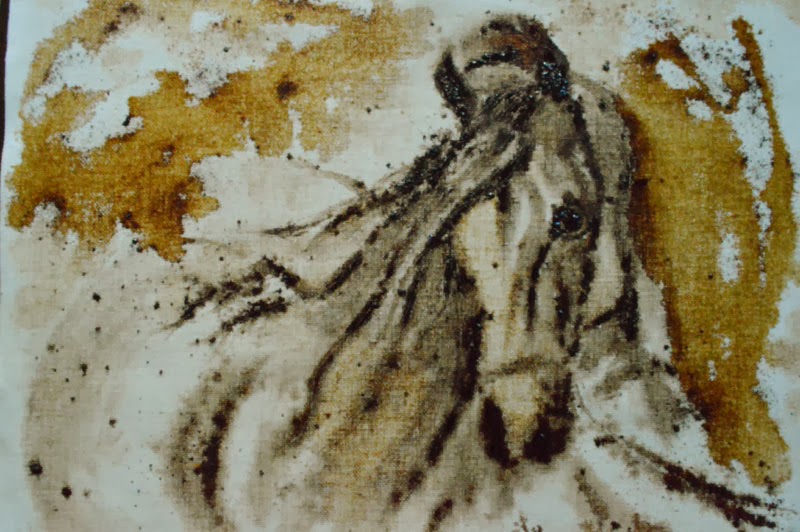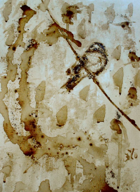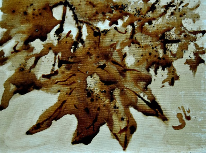 Art with coffee stains on canvas is an inspired thought that struck me like a bolt from the blue. May seem silly but it was a closer look at my stained white coasters that actually gave me the idea that coffee can make tough but brilliant stains. So I don't really paint with coffee. I make stains. Stains that will last as long as they can... unfazed. I drip the decoction on canvas cloth. Use spoons and knives to make tiny rivulets. Arrest the flow where I wish. Blow. Blot. Bake. Spatter dry coffee on wet surface. I have explored most aspects of its diuretic nature to play the medium to its maximum benefit.