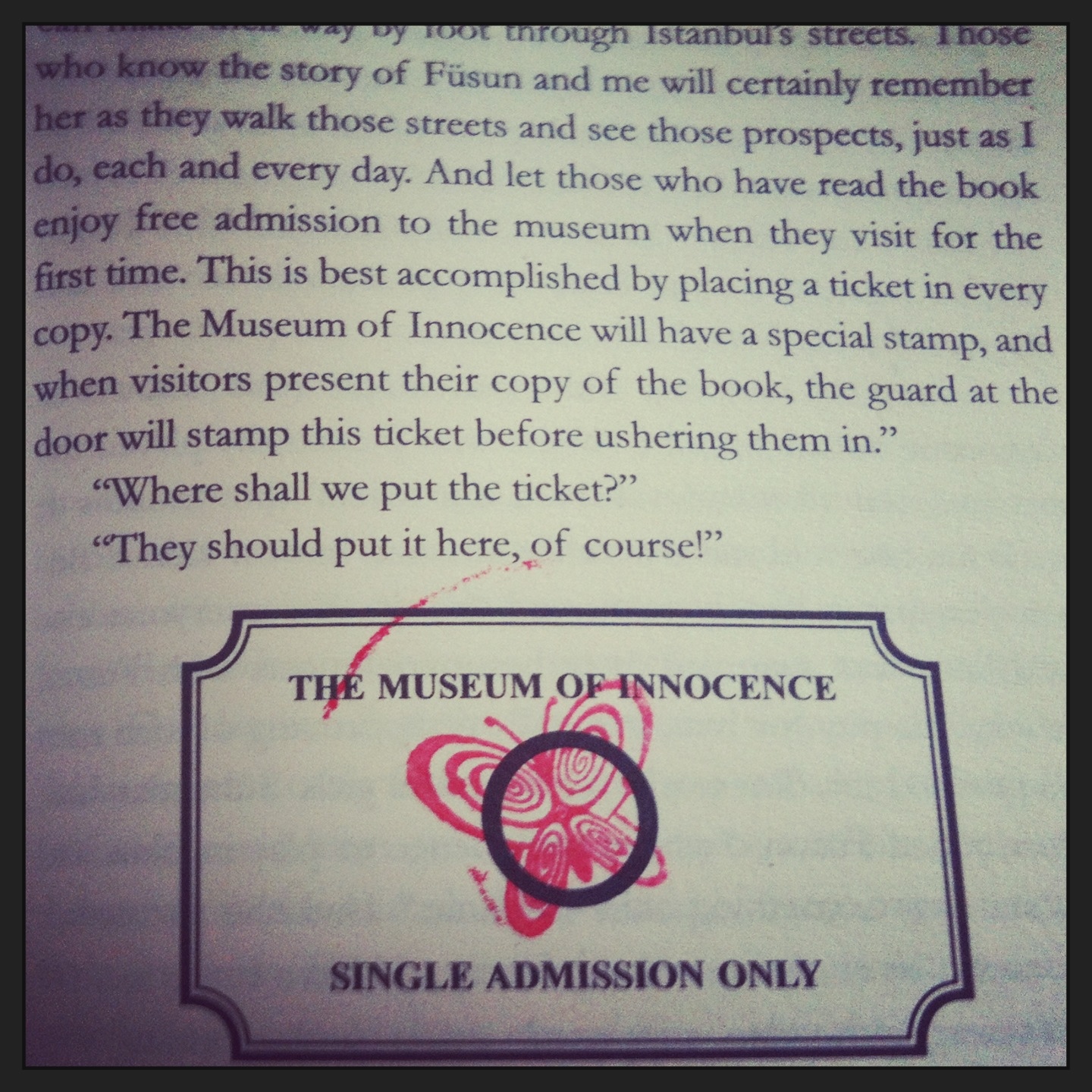| The museum allows free entry to those who bring a copy of the book. A ticket placed in the 83rd chapter of the book will be stamped before ushering the reader in. |