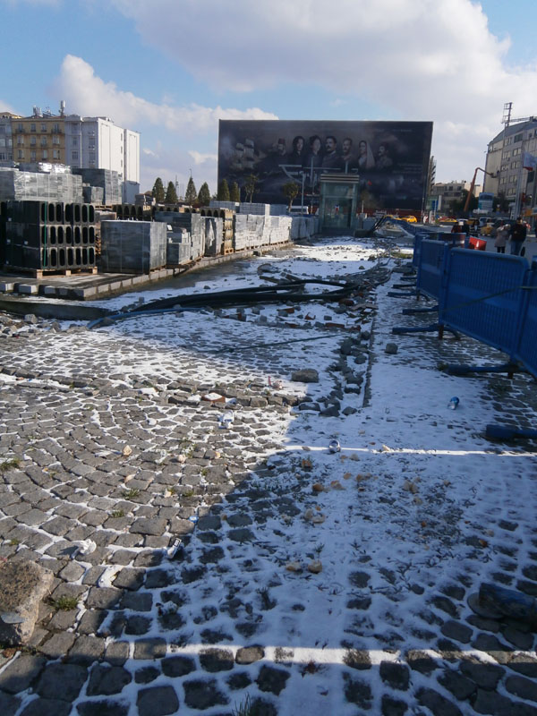 | Snow settles between the cobblestone pavements from Taksim square to Istiklal Cadessi... there at the far end you can see the poster of a much talked about and recent Turkish film Ertuğrul 1890 |